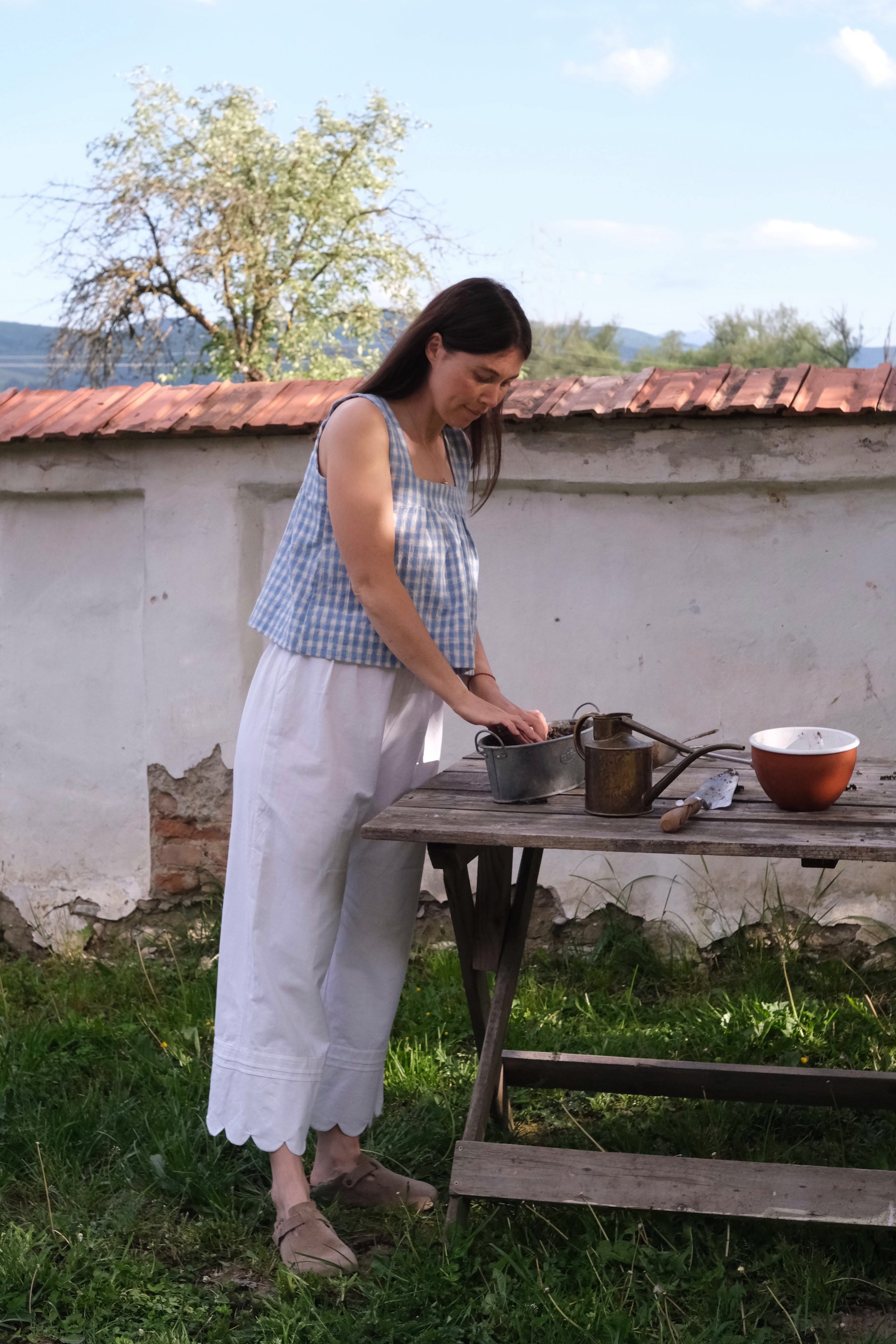 Crafted in a lightweight cotton, the Hortensia pants features two layer of pintucks, large scallops at the hem, and it has stretchy waist. It is an effortless pull-on style with a wide leg and high waist.