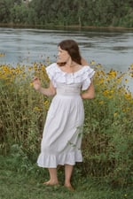 The Jolán is a dreamy summer dress with a lot of frilly details and it is practical with the side pockets. The neckline is adjustable with tie.