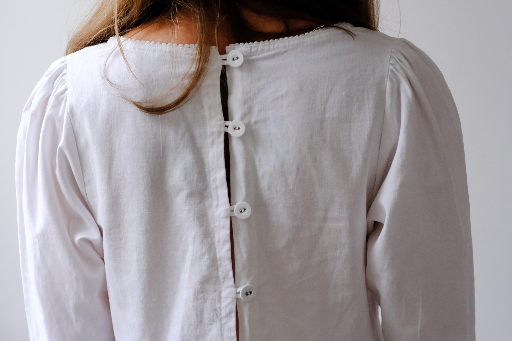 In midweight cotton, the Olga dress features a plunging V-neckline with cotton crochet lace trim. It has fitted high waist, slightly puff shoulders, full-length sleeves, and closure with cotton buttons.