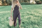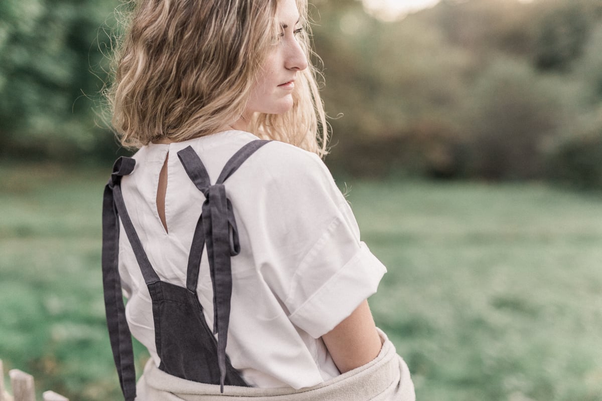 The Irma linen high waist dungarees features a side button closure and it has knottable shoulder straps.